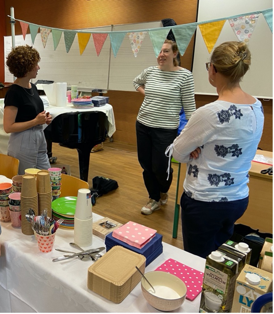 Die Atmosphäre im umgestalteten, nicht wiederzuerkennenden Musikraum im Neubau war einladend und gemütlich. Die SV hatte eine Cocktail-Bar aufgebaut und einige Eltern hatten ein Kuchenbuffet mit leckeren Muffins, Kuchen sowie Kaffee und Tee zusammengestellt. Beim Stöbern oder beim Naschen der Leckereien sind tolle Gespräche zwischen Schüler*innen, Lehrer*innen und Eltern entstanden.